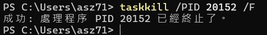 如果有進程正在佔用該端口,根據顯示的 PID 終止該進程,下圖的 20152 就是 PID。